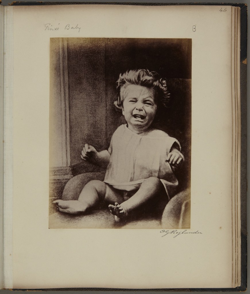 Though one could imagine that a conscious manipulation of data and figures would be intended to change the perceived outcome of the experiment, Charles Darwin used staging to the opposite effect: to better explain the argument he was already making, from the conclusions he had already drawn. Philip Prodger’s “Inscribing Science” addresses the idea that Darwin’s intentions behind the manipulation of photography. In his The Expression of the Emotions in Man and Animals (heretofore “Emotions”), Darwin makes great use of the then-fairly-new medium of photography to provide actual images of expressed emotions in people. As Prodger asserts, “His photographic illustrations were carefully contrived to present evidence Darwin considered important to his work” (Prodger 144). Given that the medium was relatively new at the time, it had its limits in terms of both detail and exposure time, “in the order of tens of seconds” (Prodger 156). As a result, some tweaking, staging, and manipulation were necessary to accurately convey Darwin’s selected evidence. He collaborated with both Oscar Rejlander and Duchenne de Boulogne in generating images for Emotions, with the former providing photographs of posed emotions, and the latter, photos of electrode-induced facial expressions. Darwin manipulated both for his book. In the case of Rejlander, Darwin removed electrodes and scientific equipment from the photos, leaving only the induced emotion visible in the book (Prodger 166-169). One of Rejlander’s photographs, known as Ginx’s Baby, was so important for the book that Darwin created a photograph of a drawing of the photo, so as to ensure that all details of the image were captured perfectly (Prodger 173-5). At the same time, for the photographs produced by both men, Darwin changed the settings of the subjects, going so far as to place Ginx’s Baby into a comfortable chair.
